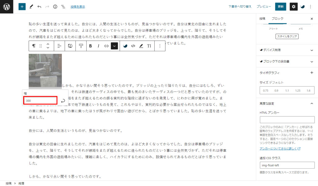 テキスト入力した段落を選択し、ブロック設定の「テキスト設定」「ドロップギャップ」をONにします。